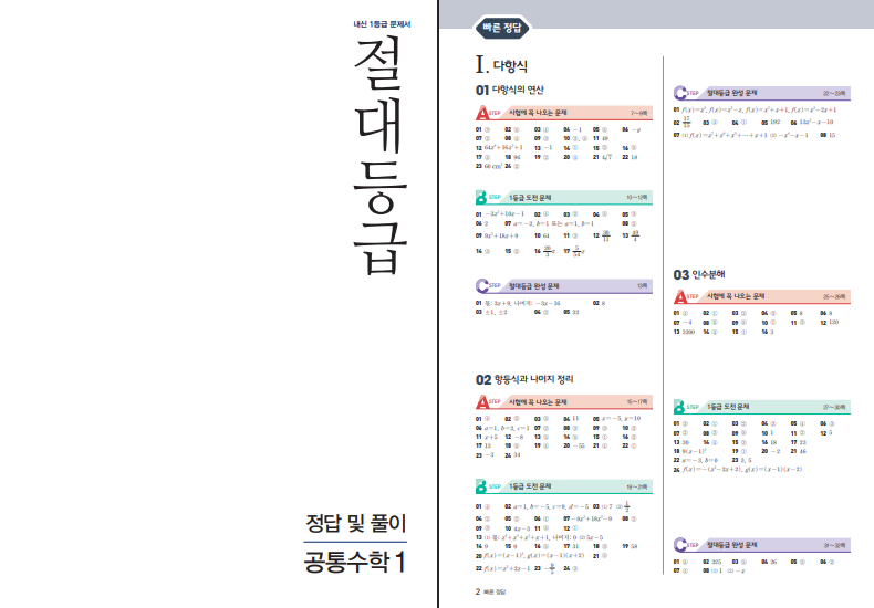 개념서를 이미 1회독한 학생이 내신 실전 감각을 끌어올릴 때 특히 효과가 크며, 유형 암기 대신 ‘출제의도 → 전략 → 풀이’ 흐름으로 연습하고 싶은 학습자에게 어울립니다. 단원별로 스스로 미니 모의 문제를 엮어 복기하고 학교 프린트와 함께 오답 노트를 구축하면 학습 효율이 높아집니다. 공통수학1의 핵심 난제인 이차함수 해석과 여러 가지 방정식·부등식 파트의 시간 압박을 견디는 힘을 길러 주는 구성이므로, 상위권 도달을 목표로 한다면 메인 실전서로 선택할 만합니다. 본문에 공통수학1 절대등급 답지 pdf 파일을 첨부해두었습니다. 교육과정이 바뀌었으므로 표지를 꼭 확인하시길 바랍니다.