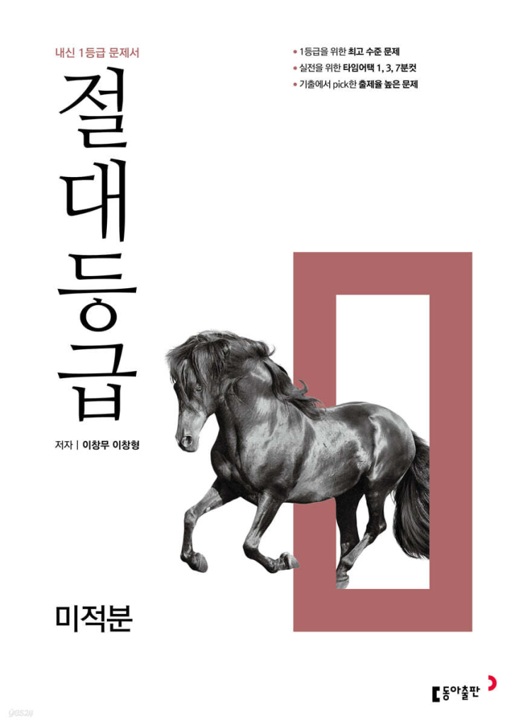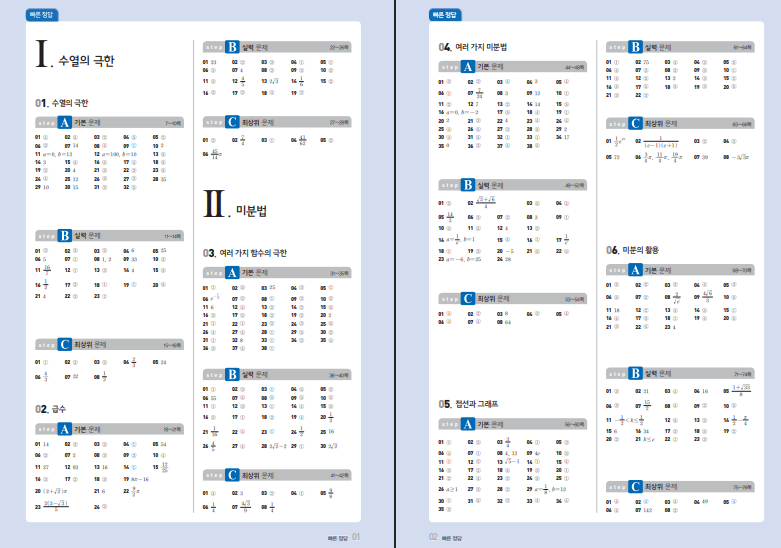 절대등급 미적분 내신 1등급 문제서는 내신 상위권을 목표로 하는 학생을 겨냥한 실전형 문제집입니다. 학교 시험의 출제 빈도가 높은 유형을 선별해 ‘기본·실력·최상위’ 3단계로 배열하고, 1·3·7분 타임어택을 적용해 시간 관리와 정확도를 동시에 훈련하게 구성했습니다. 제한 시간 안에서 핵심 아이디어를 포착하고 계산을 완주하는 루틴을 반복하도록 설계되어 실전 감각을 빠르게 끌어올릴 수 있습니다. 아래 미적분 절대등급 답지를 첨부해두도록 하겠습니다. 교육과정이 바뀌고 있으므로 표지를 꼭 확인하시길 바랍니다.