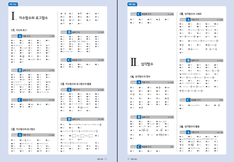 구성은 수학1의 핵심 축을 고르게 다룹니다. ‘지수와 로그’에서는 정의와 계산 규칙을 확립한 뒤 지수함수·로그함수의 성질과 그래프 해석으로 확장합니다. ‘삼각함수’ 단원에서는 도형 기반의 정의에서 출발해 주기·위상 이동 등 그래프 특성, 실전 활용까지 단계적으로 연결합니다. ‘수열’은 등차·등비수열의 기본 식을 견고히 다진 뒤, 수열의 합과 수학적 귀납법으로 마무리해 서술형 대비에 필요한 논증 능력까지 챙길 수 있게 했습니다. 단원 간 연결 고리가 분명해, 함수 시야로 보는 그래프 해석과 수열의 규칙성 인식이 자연스럽게 맞물립니다. 아래 링크를 통해 수1 절대등급 답지를 열람할 수 있습니다.