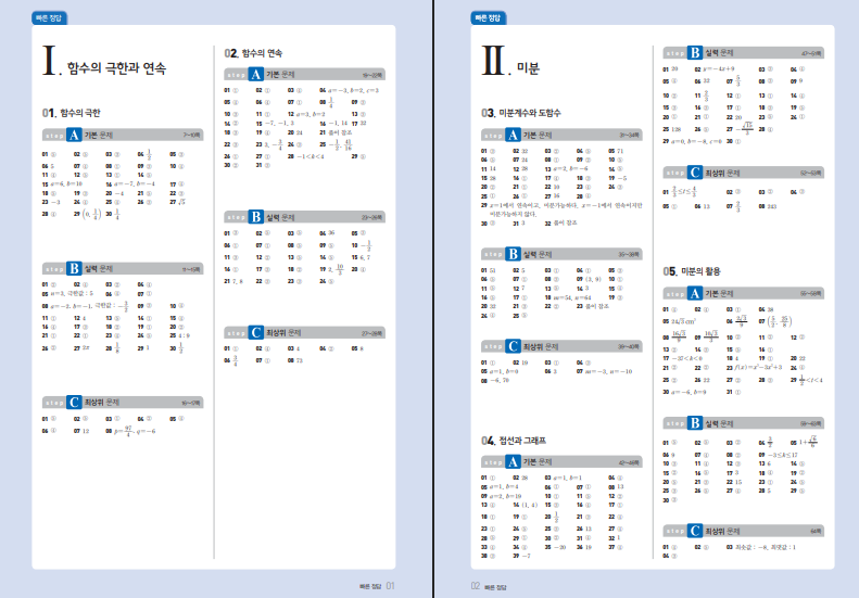 단원별 학습 동선도 분명합니다. ‘함수의 극한과 연속’에서는 극한 성질과 극한 존재 판정, 점·구간 연속을 연결하여 그래프 해석과 대수적 계산을 오가게 합니다. ‘미분’에서는 미분계수와 도함수의 의미를 출발점으로 증가·감소, 극값, 접선 기울기와 그래프 스케치를 묶어 사고 흐름을 단축하도록 유도합니다. ‘미분의 활용’ 파트는 최댓값·최솟값 응용, 속도·가속도 해석 등 출제 빈도가 높은 문항을 시간 관리 관점에서 훈련하게 합니다. ‘적분’은 부정적분 기본 공식과 정적분의 성질을 토대로 넓이 문제까지 확장하여, 도형적 직관과 식 처리 능력이 균형 잡히게 구성되었습니다. 이러한 흐름은 이후 미적분 과정으로 자연스럽게 이어지는 교두보 역할을 합니다.