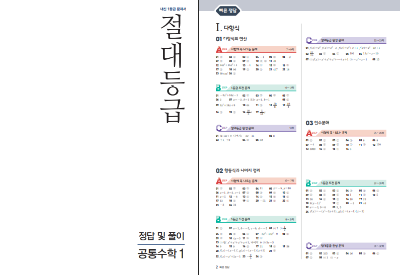 구성을 보면 학교 시험 문제 중 출제율이 높은 문제를 세 단계로 나누어 실력을 점검할 수 있게 만든 점이 특징입니다. 시험에 꼭 나오는 문제 1분컷, 1등급 도전 문제 3분컷, 절대등급 완성 문제 7분컷으로 이어지는 방식이라서, 단순히 문제를 많이 푸는 것이 아니라 제한된 시간 안에서 정확하게 푸는 연습을 하게 됩니다. 공통수학1에서 중요한 다항식의 연산, 항등식과 나머지정리, 인수분해부터 복소수와 이차방정식, 판별식, 여러 가지 방정식과 부등식, 순열과 조합, 행렬까지 핵심 단원이 모두 들어 있어 시험 대비 범위를 한 권으로 정리하기 좋습니다. 특히 문제를 풀 때 필요한 사고 과정을 단계적으로 익히게 해 주기 때문에, 계산력만이 아니라 문제 해석력도 함께 키우는 데 도움이 됩니다.
