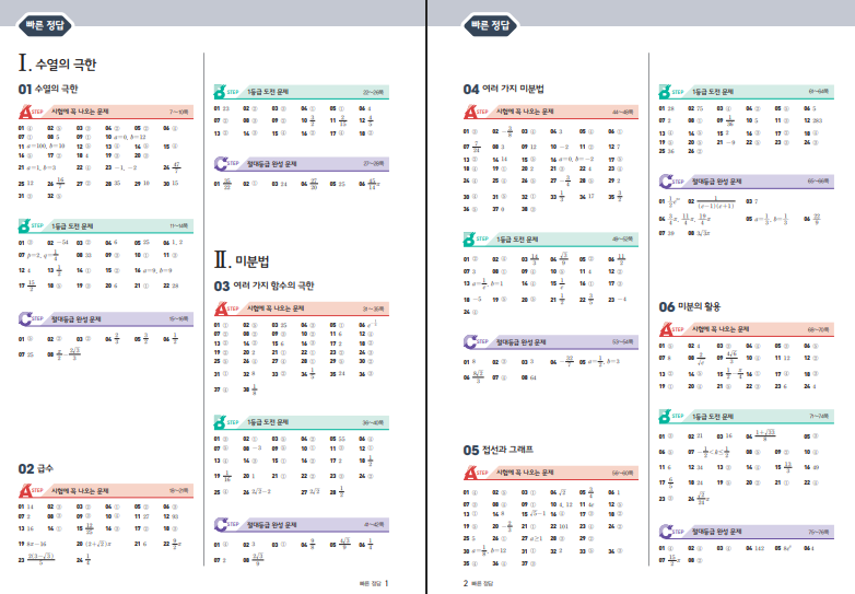 절대등급 미적분2 내신 1등급 문제서는 2022 개정 교육과정을 반영한 고등 수학 문제집으로, 학교 시험에서 상위권 성적을 목표로 하는 학생에게 잘 맞는 교재입니다. 미2는 수열의 극한과 급수, 여러 가지 함수의 극한, 미분법, 적분법처럼 개념의 난도가 높고 단원 간 연결도 강한 과목이라서, 단순히 공식만 외우는 방식으로는 좋은 점수를 받기 어렵습니다. 이 책은 제목 그대로 내신 1등급을 목표로 만든 문제서답게, 기본 유형을 넘어서 준킬러 수준까지 대비할 수 있도록 구성된 점이 특징입니다. 학교 시험에서 시간 안에 정확하게 푸는 훈련이 필요한 학생에게 특히 실용적인 교재라고 볼 수 있습니다. 아래 미적분2 절대등급 답지를 올려두겠습니다.