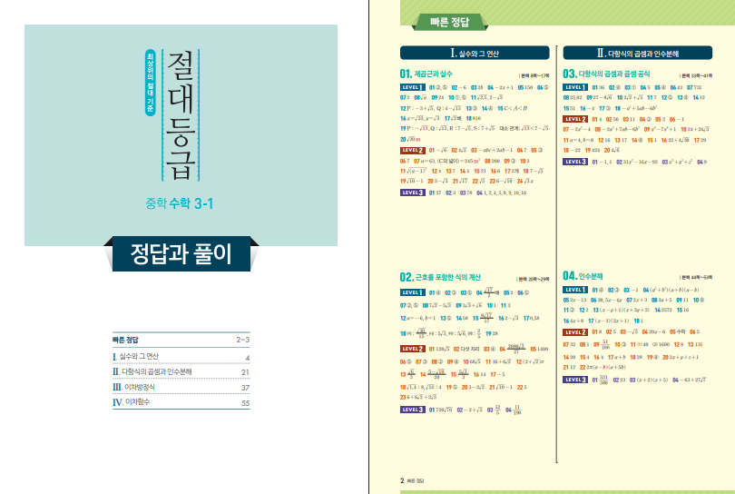 절대등급 중학 수학 3-1 (2025년용)은 중학교 3학년 2학기 과정을 상위권 수준으로 다룬 심화형 문제집입니다. 제곱근과 실수, 인수분해, 이차방정식, 이차함수 등 고등 수학의 기초가 되는 핵심 단원들을 깊이 있게 다루고 있습니다. 강남과 목동 등 전국 우수 학군의 기출문제를 분석해 반영하였으며, 실제 내신 문제의 출제 경향을 체계적으로 익히도록 구성되어 있습니다. 단순한 반복 연습이 아니라 문제를 ‘이해하며 푸는 과정’을 중시하여, 수학적 사고력을 기르는 데에 초점을 맞추고 있습니다. 아래 절대등급 중3-1 답지를 pdf 파일로 올려두도록 하겠습니다. 표지를 꼭 확인하시길 바랍니다.