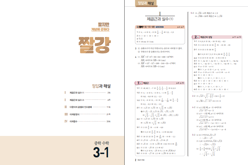 위 링크를 통해 짤강 중학 수학 3-1 답지를 열람할 수 있습니다. 해당 교재의 가장 큰 장점은 짧은 분량 안에서도 학습의 완결성을 유지했다는 점입니다. 각 단원은 ‘기초 내용 피드백’으로 시작해 학습 전 필요한 배경지식을 정리하고, ‘오답의 예’를 통해 자주 실수하는 부분을 짚어줍니다. 예제와 문제는 난이도를 단계별로 조정해 기초를 다지고 개념을 바로 적용할 수 있게 구성되었습니다. 또한 ‘기초 개념 평가’와 ‘기초 문제 평가’가 단원 마지막에 배치되어 있어 스스로 학습 성취도를 확인하기 좋습니다. 전체적으로 어려운 심화보다는 이해 중심의 문제로 구성되어 있어, 학기 초 선행학습이나 시험 전 정리용으로 활용하기에 알맞습니다.