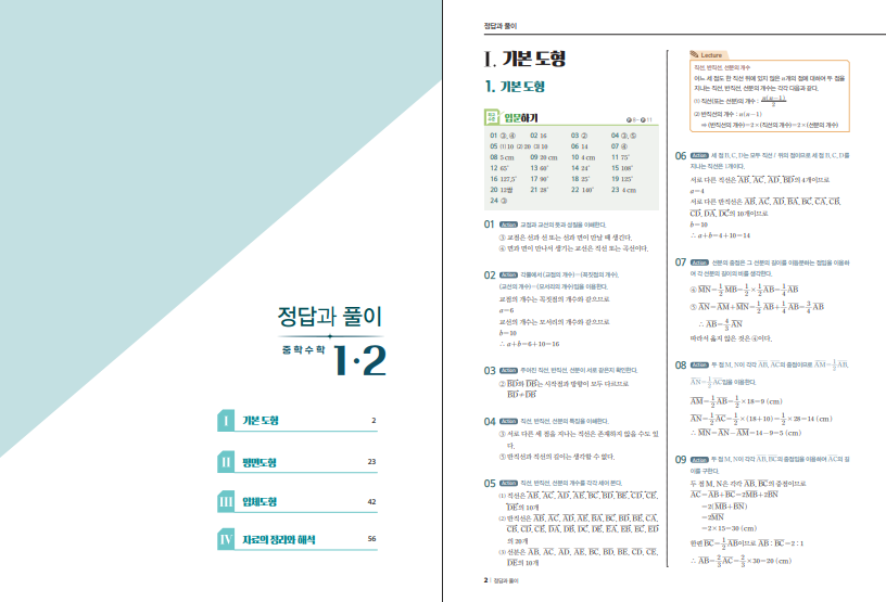 위 링크를 통해 최고수준 중1-2 답지를 열람할 수 있습니다. 난이도 구성도 단계적입니다. ‘최고수준 입문하기’로 필수 난도를 안정화한 뒤 ‘최고수준 완성하기’에서 내신 만점을 겨냥한 응용을 다루고, ‘최고수준 뛰어넘기’에서는 최상위 문항으로 사고의 깊이를 넓힙니다. 예를 들어 원과 부채꼴에서는 중심각·호의 길이·부채꼴 넓이의 관계를 상황 문제로 변주하고, 입체단원에서는 전개도·단면·합동 조건을 한 번에 요구하는 복합 문항으로 변별력을 확보합니다. 풀이를 식·문장·도형 표시로 정교하게 기록하도록 유도하는 해설 설계도 인상적입니다.