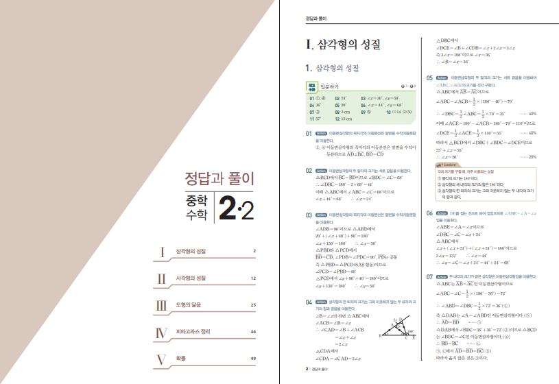 학습 범위는 ‘삼각형의 성질’과 외심·내심에서 시작하여 ‘평행사변형·여러 가지 사각형’으로 확장하고, 이어 ‘도형의 닮음’과 다양한 활용, ‘피타고라스 정리’의 심화 응용까지 다룹니다. 마지막 ‘경우의 수·확률’ 단원은 개념 정의와 계산 절차, 상황 해석을 연계해 서술형과 고난도 객관식에 모두 대비하도록 구성되어 있습니다. 각 단원은 개념 확인 → 대표 유형 → 발전 문제 → 서술형으로 마무리되어 복습과 시험 대비가 한 흐름 안에서 완결됩니다.