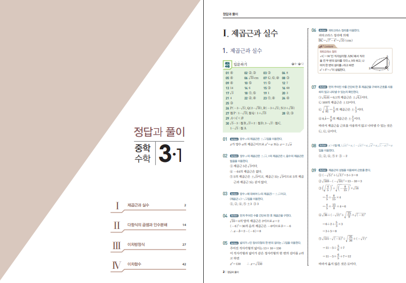 위 링크를 통해 최고수준 중학수학 3-1 답지를 열람할 수 있습니다. 학습 범위는 ‘제곱근과 실수’의 정확한 개념 이해와 근호식 계산에서 출발하여, ‘다항식의 곱셈·인수분해’의 공식 활용과 구조 파악, ‘이차방정식’의 다양한 풀이법과 실생활/통합 맥락의 활용, ‘이차함수’ 그래프 해석과 응용까지 차례로 다룹니다. 각 단원은 개념 확인→대표 유형→발전 문제→서술형으로 마무리되며, 소단원 마감 테스트를 통해 약점을 즉시 점검할 수 있도록 구성되어 있습니다. 단원 간 연결 문제를 통해 전 범위 통합 사고도 훈련합니다.