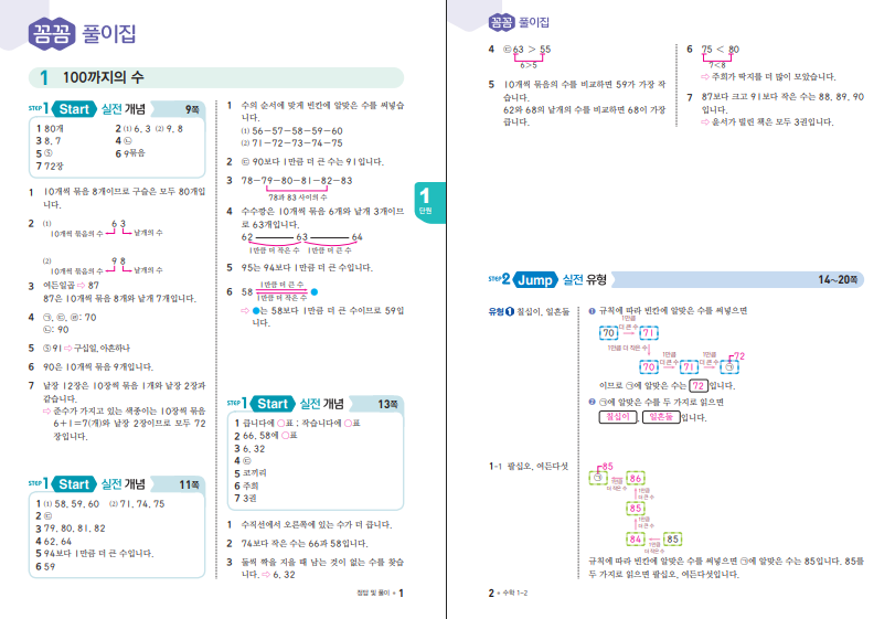 이 교재의 가장 큰 장점은 ‘문제 중심 심화’와 ‘모바일 보조 학습’의 결합입니다. 표지 QR을 통해 2~4단계 풀이 동영상, 쌍둥이 문제, 정답률 30% 이하의 경시 유형까지 추가 제공되어 같은 개념을 여러 각도에서 반복·확장할 수 있습니다. 본책 해설에는 ‘자세한 풀이, 다른 풀이, 참고, 주의’가 실려 있어 아이가 왜 틀렸는지, 어떤 접근이 더 효율적인지 스스로 점검하기 좋습니다. 특히 1학년 단계에서 자주 발생하는 계산 실수와 조건 누락을 ‘주의’란으로 예방하는 구성이 돋보입니다.