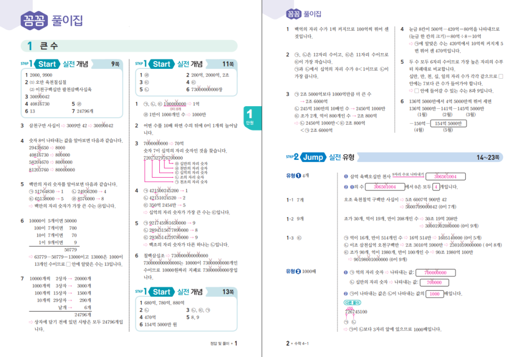 위 링크를 통해 최고수준 4-1 답지를 열람할 수 있습니다. 학습 지원은 QR 기반 2~4단계 문제풀이 동영상, 같은 개념을 수치만 바꿔 재연습하는 ‘쌍둥이 문제’, 정답률 30% 이하 경시 유형 제공으로 빈틈을 즉시 메우는 구조입니다. 해설서는 ‘자세한 풀이–다른 풀이–참고–주의’까지 갖춰 한 문제를 여러 전략으로 비교 학습할 수 있어 오답 교정이 빠르고, 부모가 코칭하기도 수월합니다.