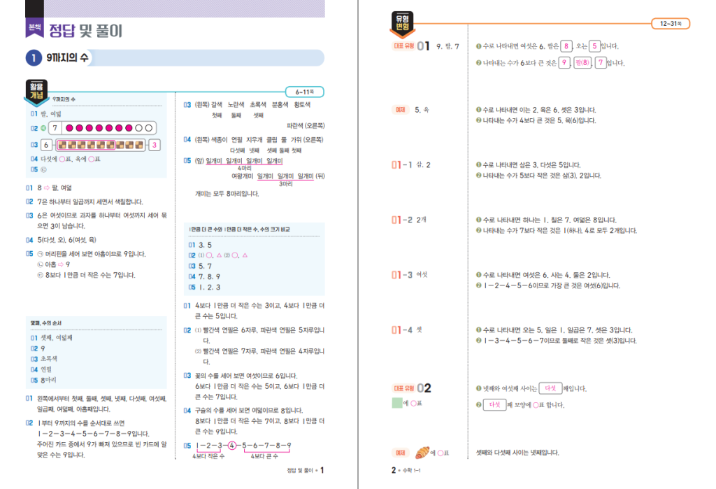 운영은 주 5일, 하루 15~20분의 짧은 루틴을 권합니다. 월·화에는 ‘활용개념+대표유형 예제’로 따라 풀기, 수요일에는 유형변형 4~6문항으로 독립 풀이, 목요일에는 실전적용 4문항으로 전이 연습, 금요일에는 복습책에서 같은 유형을 5~8문항 돌려 보며 자동화를 노립니다. 단원 말에는 5분 점검을 통해 “오늘 배운 개념 한 줄 요약→예시 하나 만들기→틀린 문제 다시 풀기”의 순서를 고정합니다. ‘9까지의 수’와 ‘50까지의 수’는 수 모형·수직선·손가락 수 세기 등 구체물 활동을 병행하고, ‘여러 가지 모양’은 실물 찾기(집·교실에서 원·세모·네모 사물 사진 찍기)와 연결하면 기억이 오래갑니다.