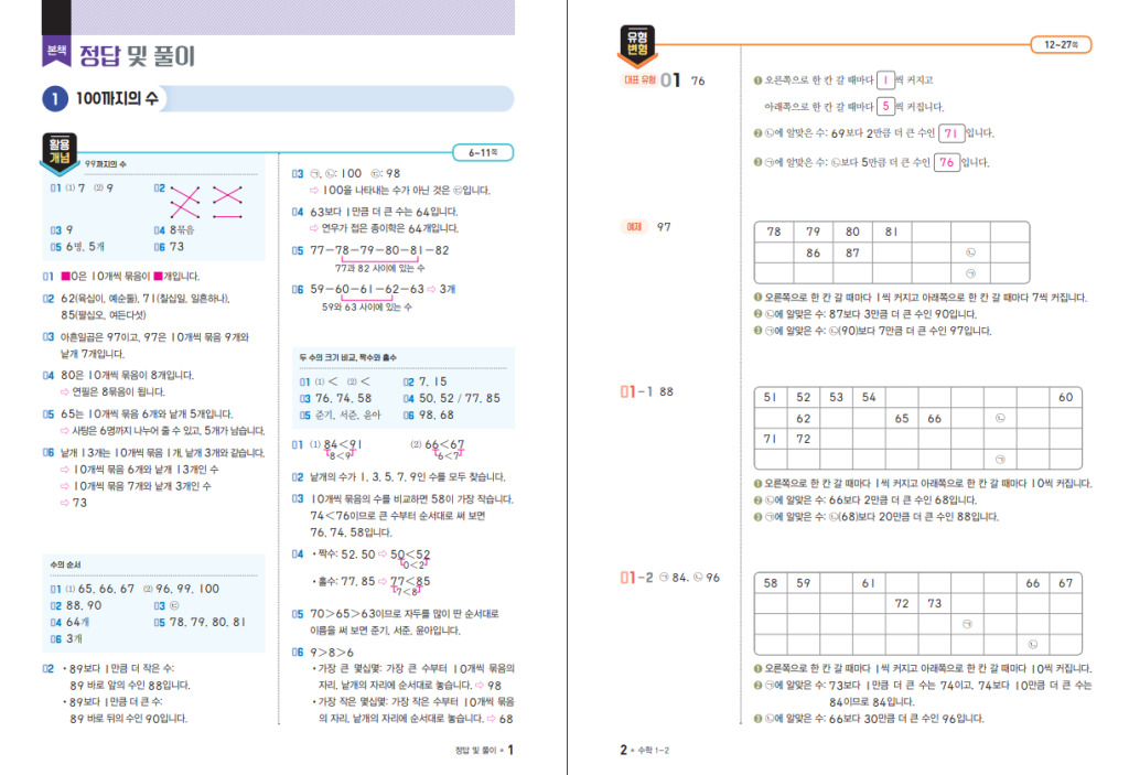 핵심 학습법은 〈활용개념→유형변형→실전적용〉의 3단계 시스템입니다. 먼저 그림과 구체적 예시로 개념을 안정시키고, 대표유형 예제에서 제시하는 ‘해결 솔루션’을 따라 하며 풀이 절차를 손에 익힙니다. 이어 조건만 달라진 변형 문제로 전이를 연습하고, 마지막에 유사 문제로 스스로 점검하며 누수를 막습니다. 복습책에는 유형변형·실전적용의 닮은꼴 문제가 수록되어 같은 구조를 다른 수치로 반복 훈련하게 해 계산 정확도와 속도를 동시에 끌어올립니다. 풀이 과정 기록을 강조하는 안내도 있어 정답 확인을 넘어 사고 과정을 말로 설명하는 습관을 만들기 좋습니다. 아래 링크를 통해 최고수준S 1-2 답지를 열람할 수 있습니다.