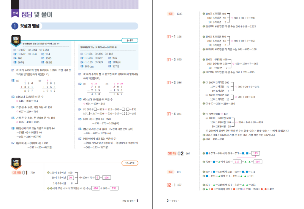이 책의 엔진은 〈활용개념→유형변형→실전적용〉 3단계입니다. 먼저 그림·모형·사례로 개념을 ‘보이게’ 하고, 대표유형 예제에서 ‘해결 솔루션’을 따라 하며 풀이 절차를 손에 익힙니다. 이어 조건만 달라진 변형 문제로 전이를 연습하고, 마지막 유사 문제로 스스로 점검해 누수를 막습니다. 복습책에는 유형변형·실전적용의 닮은꼴 문제가 배치되어 같은 구조를 다른 수치로 반복하며 정확도와 속도를 함께 끌어올립니다. 오답은 “틀린 까닭 한 줄→바로잡은 풀이 한 줄”로 기록하면 재발을 줄일 수 있습니다. 아래 링크를 통해 최고수준수학S 3-1 답지를 열람할 수 있습니다.