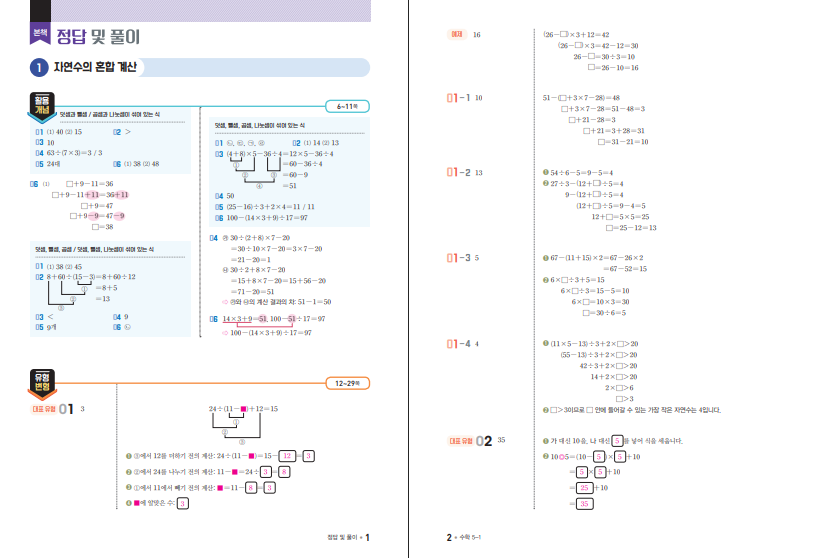 단원 구성은 5학년 1학기 핵심인 자연수의 혼합 계산, 약수와 배수, 규칙과 대응, 약분과 통분, 분수의 덧셈·뺄셈, 다각형의 둘레와 넓이로 짜여 있습니다. 특히 혼합 계산과 분수 파트는 대표 유형의 풀이 절차를 단계별로 보여 주어 개념 전이가 수월합니다. ‘규칙과 대응’은 표와 식으로 옮기는 연결 문제가 충실하며, ‘다각형’ 단원은 공식을 암기시키기보다 조건을 분해해 적용하게 하는 문항이 많아 사고 과정을 훈련하기에 적합합니다. 서술형 문항도 풀이의 이유를 말하게 하는 발문이 깔끔합니다. 아래 링크를 통해 최고수준S 5-1 답지를 열람할 수 있습니다.
