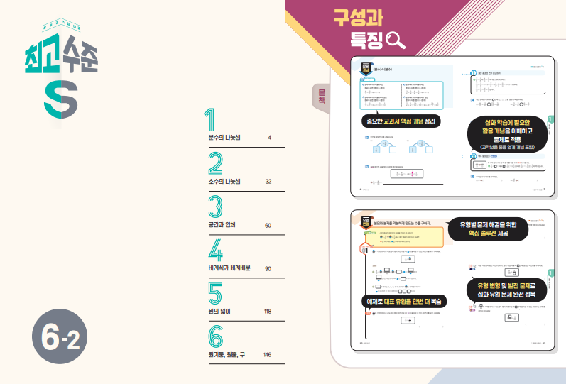 단원은 ‘분수의 나눗셈, 소수의 나눗셈, 공간과 입체, 비례식과 비례배분, 원의 넓이, 원기둥·원뿔·구’로 구성되어 연산·비례·입체도형을 균형 있게 다룹니다. 분수·소수 나눗셈은 역수 전환, 소수점 자리 결정, 약분 타이밍 같은 실수 포인트를 예제와 변형 문제로 반복해 정확도를 끌어올립니다. ‘공간과 입체’ 및 원 관련 단원은 전개도 이해, 단위 환산, 공식을 선택하는 판단 과정을 강조해 중학 기하로 자연스럽게 연결되도록 설계되어 있습니다. 아래 링크를 통해 최고수준S 초등수학 6-2 답지를 열람할 수 있습니다.
