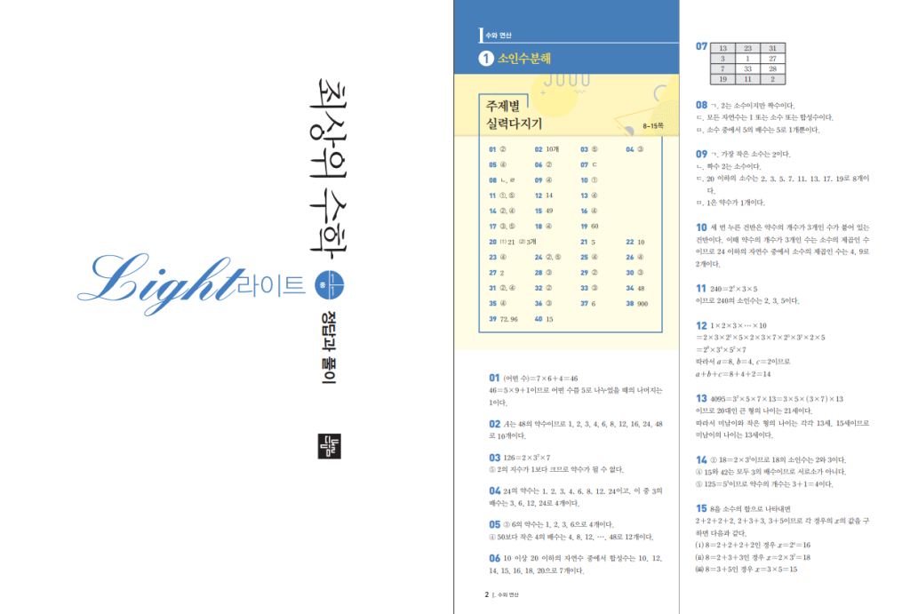 정리하면 라이트 시리즈는 수학을 안정적으로 다지면서도 조금 더 높은 수준의 문제까지 경험하고 싶은 학생에게 추천할 만한 책입니다. 너무 강한 심화서는 부담스럽고, 그렇다고 기본 문제집만으로는 아쉬운 경우에 특히 잘 맞습니다. 이후 중1-2나 일반 최상위수학으로 이어 가기에도 흐름이 자연스러운 편입니다. 구입할 때는 학년, 학기, 교육과정을 함께 확인해 보시길 바랍니다. 본문에 2022 개정 최상위수학 라이트 중1-1 답지를 첨부해두었습니다. 표지를 꼭 확인하시길 바랍니다.