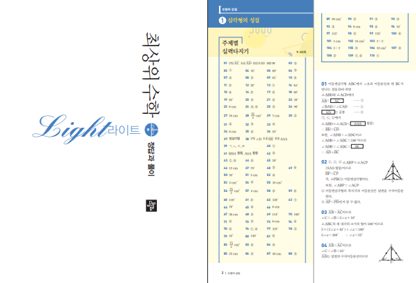 최상위수학 라이트 중 2-2는 너무 어렵지 않으면서도 한 단계 높게 공부하고 싶은 학생에게 잘 맞는 교재입니다. 2022 개정 교육과정을 반영한 책이며, 더 잘하길 원하는 중상위권 학생을 위한 연계학습서라는 점이 특징입니다. 삼각형의 성질, 평행사변형과 여러 가지 사각형, 도형의 닮음, 피타고라스 정리, 경우의 수와 확률처럼 2학기 핵심 단원을 골고루 다루고 있어서 학교 시험 대비와 상위권 준비를 함께 할 수 있습니다. 특히 도형과 확률은 단순 계산보다 조건을 정확히 읽고 관계를 파악하는 힘이 중요하기 때문에, 이런 문제를 미리 연습해 두면 이후 심화 문제집으로 넘어갈 때도 훨씬 수월합니다. 아래 최상위 라이트 중2-2 답지 PDF 파일을 올려두도록 하겠습니다.