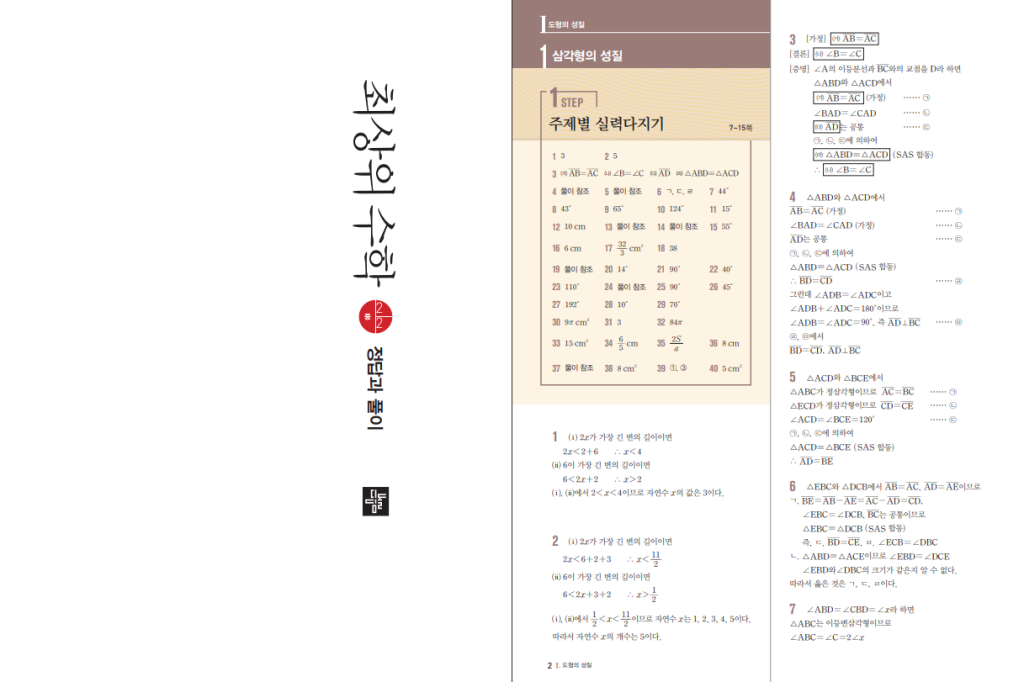 이 책의 장점은 주제별로 내용을 나누고 단계별 문제를 배치해 심화 학습이 가능하도록 만든 점입니다. 삼각형의 성질, 사각형의 성질, 닮음, 피타고라스 정리, 경우의 수와 확률처럼 중2 2학기 핵심 단원을 차례대로 다루면서 단원 종합 문제까지 연결해 실력을 점검할 수 있습니다. 특히 도형 단원은 단순 암기만으로 풀기 어려운 문제가 많고, 조건을 해석하고 관계를 스스로 정리하는 연습이 중요한데 이 교재는 그런 부분을 훈련하기에 적합합니다. 또 중간중간 미리보는 고등수학 내용이 들어 있어, 지금 배우는 개념이 이후 과정과 어떻게 이어지는지도 자연스럽게 확인할 수 있습니다.