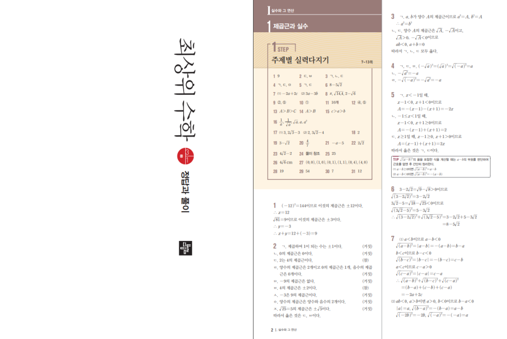 정리하면 수학을 상위권 수준으로 정리하고 싶은 학생에게 추천할 만한 책입니다. 실수, 인수분해, 이차방정식, 이차함수처럼 핵심 단원을 중심으로 심화 문제를 충분히 다룰 수 있고, 이후 고등수학으로 이어질 수 있는 사고력 훈련에도 도움이 됩니다. 다만 기초가 약한 학생에게는 처음부터 부담이 될 수 있으니, 개념기본서나 라이트 교재를 먼저 본 뒤 들어가면 훨씬 효과적입니다. 구입할 때는 학년, 학기, 교육과정을 보시길 바랍니다. 본문에 22개정 최상위 중3-1 답지를 첨부해두었습니다.