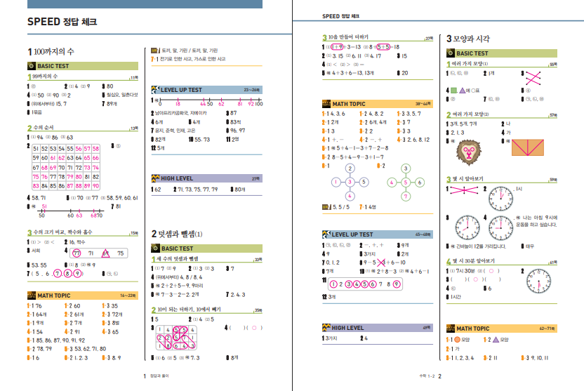 최상위 초등수학 1-2는 수학을 조금 더 깊고 단단하게 공부하고 싶은 학생에게 잘 맞는 교재입니다. 2022 개정 교육과정을 반영한 책이며, 난이도도 어려움으로 표시되어 있어 기본 문제집보다 한 단계 높은 학습을 목표로 하는 편입니다. 100까지의 수, 덧셈과 뺄셈, 모양과 시각, 규칙 찾기처럼 1학년 2학기에서 꼭 배우는 내용을 다루면서도 단순 반복보다 사고력과 문제 해결 과정을 함께 훈련하도록 구성되어 있습니다. 그래서 교과 내용을 정확히 이해하는 데서 그치지 않고, 문제를 보고 스스로 생각하는 힘까지 키우고 싶은 아이에게 더 잘 어울립니다. 특히 초등 저학년 때 수학을 재미있게 받아들이면서도 수준을 조금 더 끌어올리고 싶을 때 선택하기 좋은 교재입니다. 아래 최상위 초등수학 1-2 답지 PDF도 올려두겠습니다.