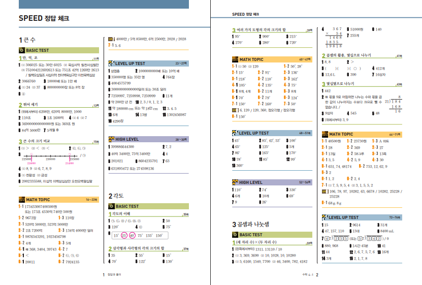 구성을 보면 왜 이 책이 꾸준히 선택받는지 이해하기 쉽습니다. 단원 도입에서는 배경지식과 함께 내용을 자연스럽게 시작할 수 있고, Basic Concept에서는 교과서 개념보다 조금 더 넓고 깊은 설명을 통해 개념을 정리하게 합니다. 그다음 기본 적용을 확인하고, 대표 심화 유형과 다양한 응용 문제를 연습하게 됩니다. 마지막 High Level 단계에서는 보다 높은 난도의 문제에 도전할 수 있어 사고력과 문제 해결력을 끌어올리는 데 좋습니다. 특별부록으로 단원별 교내 경시 문제와 수능형 사고력을 기르는 테스트도 들어 있어, 단순한 학교 진도용 문제집보다 훨씬 넓은 학습 경험을 할 수 있습니다. 아래 링크로 최상위 초등수학 4-1 답지를 함께 열람하실 수 있습니다.