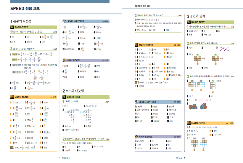 이 교재의 강점은 개념을 한 번 설명하고 끝내는 방식이 아니라, 여러 단계로 개념을 다지고 응용까지 이어 가도록 설계되어 있다는 점입니다. 단원의 도입에서는 해당 내용이 왜 중요한지 흐름을 잡아 주고, Basic Concept에서는 교과서 개념보다 조금 더 넓고 깊은 시각에서 내용을 이해하게 합니다. 이후 Basic Test로 기본 적용을 점검하고, Math Topic과 Level up Test를 통해 본격적인 심화 문제에 도전하게 됩니다. 마지막 High Level 단계에서는 난도가 높은 문제를 풀며 실력을 한 단계 더 끌어올릴 수 있습니다. 이렇게 단계가 나뉘어 있어 처음부터 너무 어렵게 느껴지기보다는 차근차근 올라가는 느낌으로 공부할 수 있습니다. 아래 링크로 최상위 수학 6-2 답지를 열람할 수 있습니다.