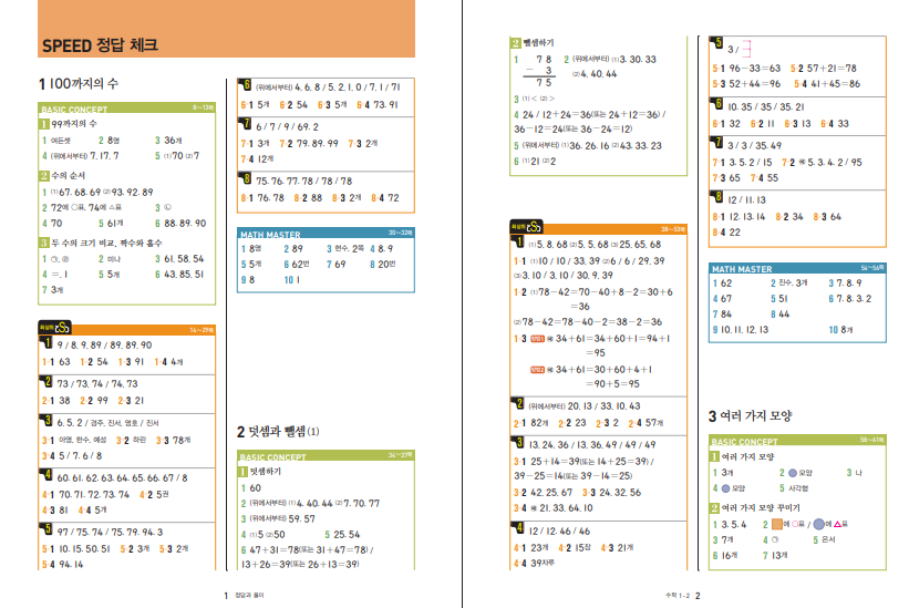 이 책의 가장 큰 특징은 교과서 개념만 설명하고 바로 문제를 푸는 방식이 아니라, 심화 개념과 이후 학년으로 이어지는 개념까지 함께 살펴본다는 점입니다. Basic Concept에서는 개념을 넓게 이해하도록 돕고, 최상위 S에서는 문장과 이미지를 통해 문제 해결의 핵심을 직관적으로 익히게 합니다. 여기에 Math Master 단계가 더해져 다양한 심화 문제와 경시 수준 문제까지 경험할 수 있도록 구성되어 있습니다. 목차를 보면 100까지의 수, 덧셈과 뺄셈, 모양과 시각, 규칙 찾기 등 학교 수업과 연결되는 내용이 중심이지만, 같은 단원 안에서도 더 깊이 생각하게 만드는 흐름이 잘 살아 있습니다.