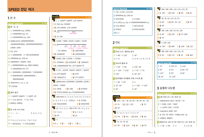 구성은 Basic Concept 단계에서 교과 개념과 심화 개념을 함께 정리하며 이해를 돕고, 최상위 S 단계에서는 이미지와 핵심 문장을 통해 문제 해결 방법을 직관적으로 익힐 수 있도록 설계되어 있습니다. 이어지는 Math Master 단계에서는 다양한 심화 문제와 경시 수준 문제를 통해 실력을 한 단계 끌어올릴 수 있으며, 문제 해결 과정에서 사고력을 자연스럽게 확장할 수 있습니다. 또한 본문 문제와 1:1로 연결된 복습 교재가 함께 제공되어 반복 학습이 가능하며, 이를 통해 개념을 확실히 정리하고 실수를 줄이는 데 큰 도움이 됩니다.
