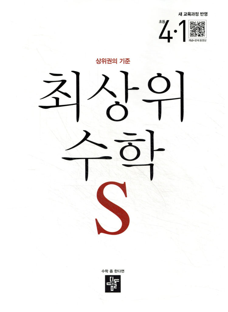 이름에서 나오는 것처럼 난이도는 높은 편이지만, 단계별로 체계적으로 구성되어 있어 꾸준히 학습하면 충분히 따라갈 수 있습니다. 심화 문제를 통해 수학적 사고력을 키우고 싶은 학생이나 상위권으로 도약하고 싶은 경우에 특히 추천할 수 있으며, 강의와 병행하면 이해도가 더욱 높아져 학습 효과가 매우 좋습니다. 교육과정이 바뀔 때마다 개정되므로 표지를 반드시 확인하시고, 본문에 22개정 최상위 수학 S 초4-1 답지 pdf 첨부해 두었습니다. 필요하신 분들은 이점 참고하시길 바랍니다. 더 많은 자료는 출판사 홈페이지에서 확인 가능합니다.