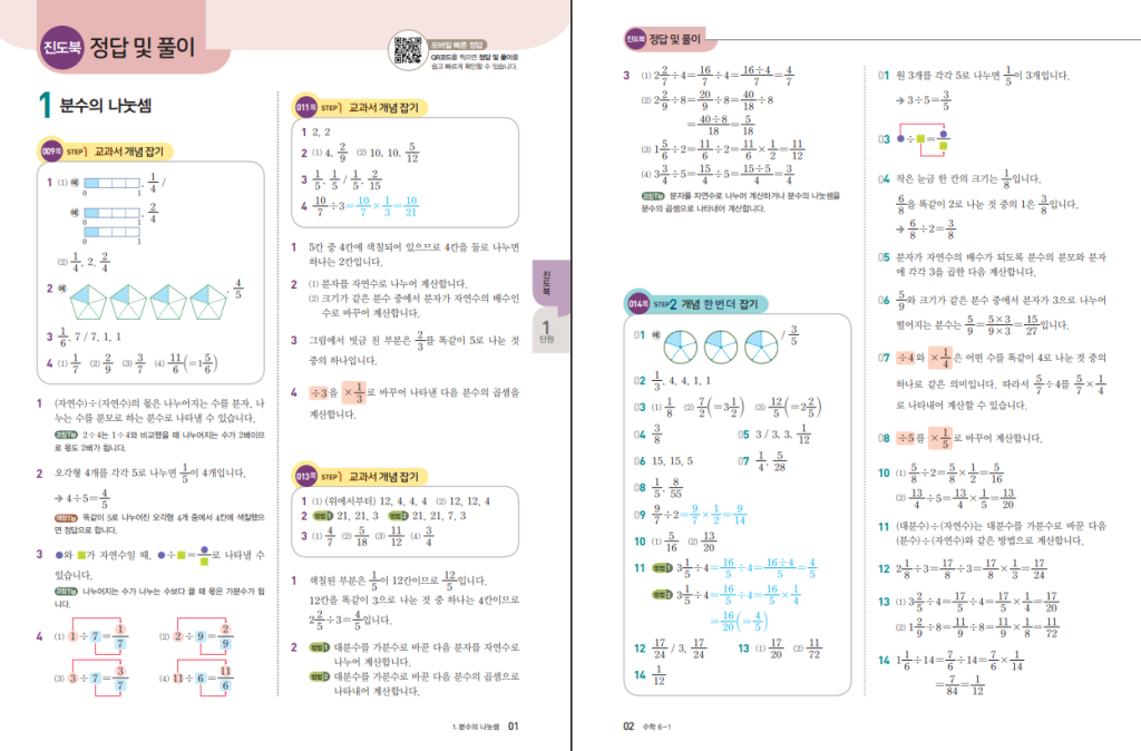 6학년 수학은 중학교 수학으로 이어지는 연결고리 역할을 하기에, 개념을 정확하게 이해하는 것이 특히 중요합니다. 큐브수학 개념서는 ‘개념 잡기 → 익힘 문제 → 서술형 문제’라는 3단계 구조를 따라가며, 문제 수나 난이도도 과하지 않게 조절되어 있습니다. 학원을 다니지 않고 집에서 학습하는 경우에도 진도표에 따라 매일 분량을 나눠 풀다 보면 자연스럽게 한 학기를 마무리할 수 있는 구성이 장점입니다. QR코드를 활용한 반복 강의 시청도 복습에 유용하며, 수학에 자신감을 심어주기 위한 학습 설계가 잘 되어 있습니다.