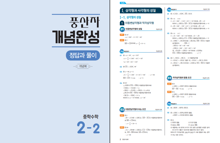 책 소개와 구성만 놓고 보면, 풍산자 개념완성 시리즈의 특징인 개념 정리와 핵심 유형 반복, 그리고 워크북 복습 구조가 그대로 적용되어 있어 학습 루틴을 만들기 좋습니다. 에전부터 유명했던 교재기에 학생들 사이에서 신뢰도가 높습니다. 특히 2학기 도형 단원은 한 번 틀린 유형이 계속 반복되는 경우가 많으니, 오답을 남겨두지 않고 워크북까지 연결해 다시 풀어보는 방식이 내신에 직접 도움이 됩니다. 본문에 22개정 풍산자 개념완성 2-2 답지 pdf 파일을 첨부해두었습니다. 표지를 꼭 확인하시길 바랍니다.