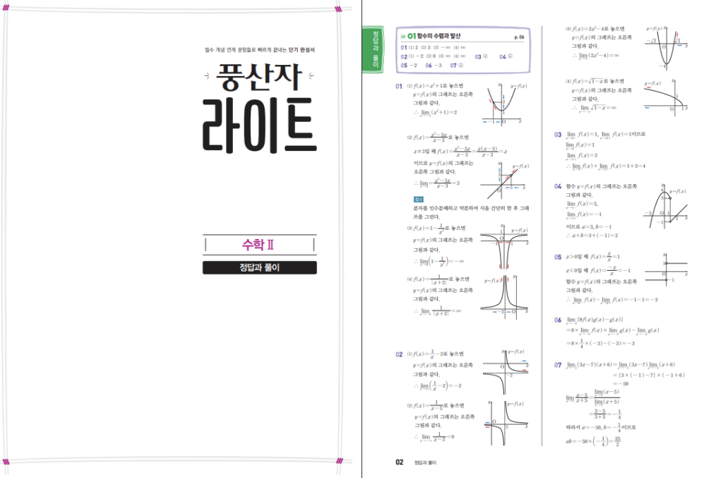 풍산자 라이트 고등 수학2 (2025년용)은 고등학교 수학Ⅱ 과정을 짧은 시간에 정리하고 싶은 학생들을 위해 만들어진 단기 완성 교재입니다. 이 책은 핵심 개념 위주로 구성되어 있어서, 수학Ⅱ의 주요 개념을 빠르게 복습하거나 시험 직전에 핵심만 정리하고 싶을 때 활용하기 좋습니다. ‘필수 개념 적용력 향상’을 목표로 만들어진 만큼, 개념과 문제의 연결이 잘 이루어져 있다는 점이 특징입니다. 아래 풍산자 라이트 수2 답지를 올려두도록 하겠습니다.