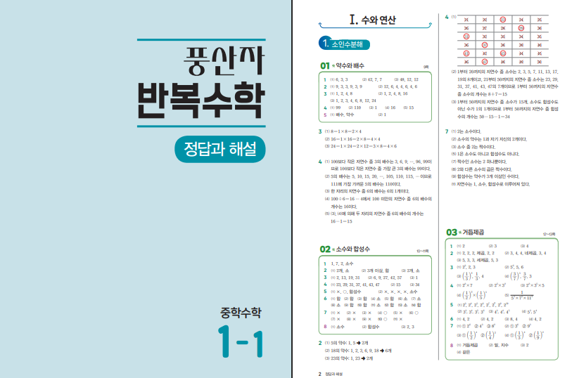 풍산자 반복수학 중학수학 1-1 (2026년)은 중학교 수학을 시작하는 학생이 가장 먼저 부딪히는 계산 실수를 줄이는 데 초점을 둔 교재입니다. 중1 1학기에서는 소인수분해, 정수와 유리수, 문자와 식, 일차방정식처럼 기본이면서도 자꾸 손이 꼬이는 내용이 많습니다. 이 책은 긴 설명으로 이해시키기보다, 핵심 개념을 짧게 잡아주고 곧바로 연습을 많이 하게 만들어서 손에 익히는 방식입니다. 그래서 학기 중에는 예습·복습용으로, 방학에는 기초 다지기용으로 쓰기 좋습니다. 아래 풍산자 반복수학 1-1 답지 pdf 파일을 올려두도록 하겠습니다.