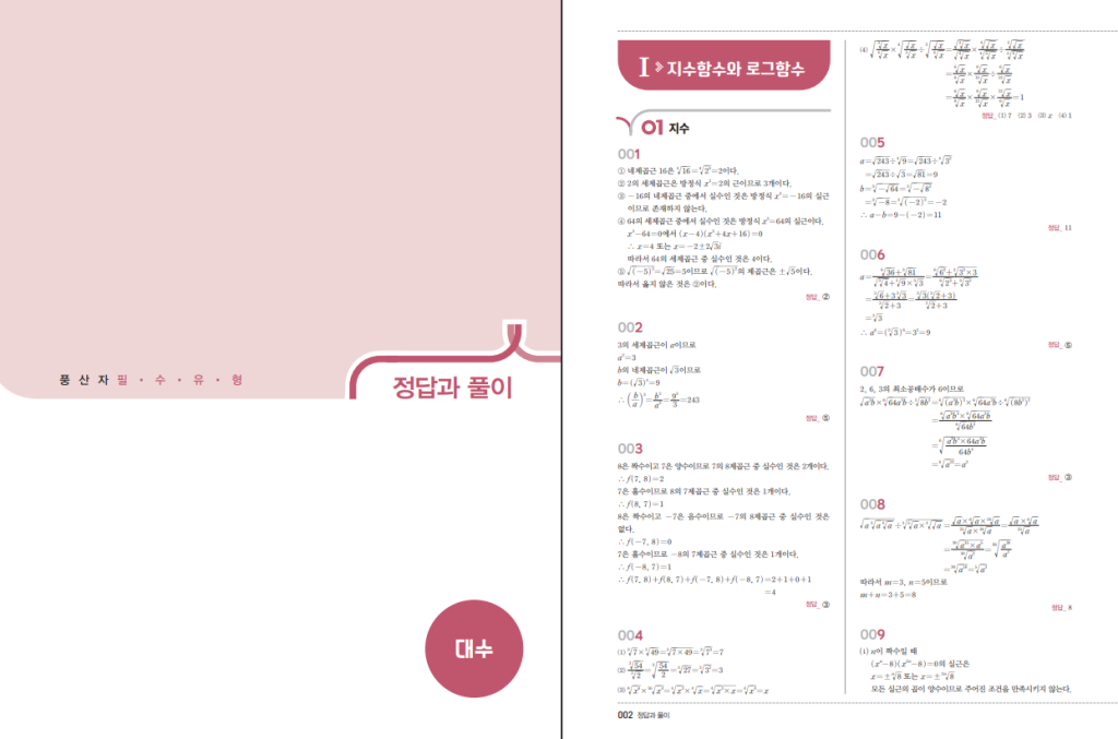 해설은 풀이가 자세하고 친절한 편이며, 한 가지 풀이만 고집하지 않고 다른 풀이도 제시해 문제의 의도와 해결 방향을 폭넓게 이해하도록 돕습니다. 이런 방식은 단순히 답만 맞히는 공부가 아니라, 같은 유형이 변형되어 나와도 흔들리지 않게 만드는 데 도움이 됩니다. 대수는 한 번에 잘 되는 단원이라기보다, 정확한 개념과 반복 연습이 쌓일수록 실력이 올라가는 단원이라서, 이 교재처럼 핵심을 정리하고 유형을 충분히 연습한 뒤 서술형·고난도로 마무리하는 흐름이 특히 효과적입니다. 내신을 안정적으로 잡고, 이후 수능 학습의 기반까지 함께 만들고 싶은 학생에게 추천할 만합니다. 본문에 22개정 교육과정 풍산자 필수유형 대수 답지를 PDF 파일로 첨부해두었습니다.