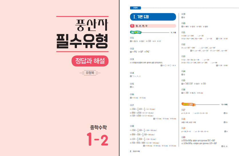 풍산자 필수유형 중학수학 1-2 (2026년)은 중1 2학기 수학을 내신 기준으로 안정적으로 끌어올리기 좋은 ‘유형 중심’ 문제기본서입니다. 2학기에는 점·선·면·각 같은 기본 도형부터 평행선의 성질, 작도와 합동처럼 조건을 읽어내야 하는 문제가 크게 늘어납니다. 이어서 다각형, 원과 부채꼴, 입체도형의 겉넓이와 부피까지 범위가 넓어지고, 마지막 통계에서는 자료를 정리하고 해석하는 방식이 처음이라 낯설 수 있습니다. 이 책은 풍쌤비법이라는 틀 안에서 꼭 필요한 유형을 정리해 주기 때문에, 도형은 감으로 푸는 것 같다는 학생도 풀이 순서를 잡아가며 공부할 수 있습니다. 아래 풍산자 필수유형 1-2 답지를 pdf 파일로 올려두도록 하겠습니다.