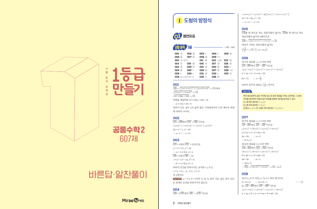 전국 고교 기출을 정교하게 분석해 고빈출·고난도만 뽑아 담은 1등급 만들기 공통수학2 607제(2025)는 2022 개정 교육과정을 충실히 반영한 실전형 문제집입니다. 평면좌표·직선·원·도형의 이동을 다루는 ‘도형의 방정식’, 집합과 명제의 논리, 그리고 합성/역·유리·무리함수까지 ‘함수와 그래프’를 607문항으로 촘촘히 커버합니다. 3단계 난이도 설계로 기초 다지기부터 1등급 결정 문제까지 자연스럽게 끌어올리며, 시험장에서 바로 통하는 풀이 감각을 기르는 데 초점이 맞춰져 있습니다. 아래 일등급 만들기 공통수학2 답지 pdf 파일을 올려두도록 하겠습니다. 표지를 참고하시길 바랍니다.