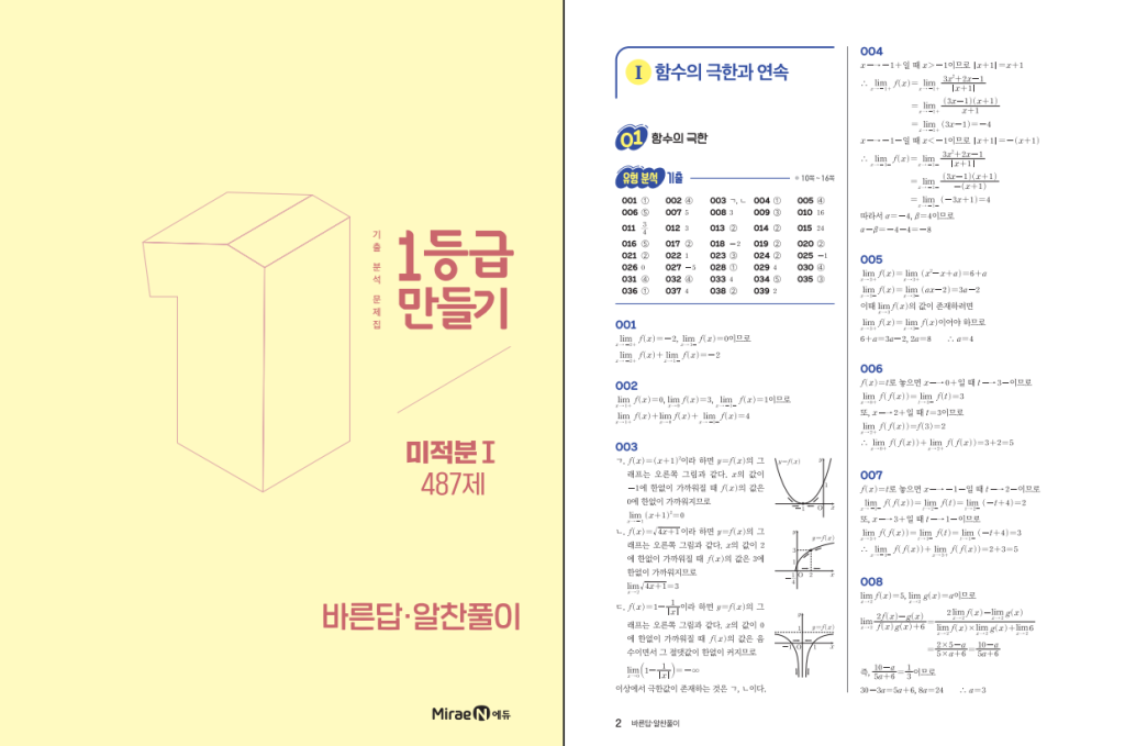 1등급 만들기 미적분1 487제는 2026학년도 대비, 2022 개정 교육과정을 정확히 반영한 실전형 문제집입니다. 전국 고교·모평 기출을 정교하게 걸러 고빈출 유형과 변형을 한 권에 묶었고, 단원 구성은 극한·연속 → 미분 → 적분으로 이어져 학습 흐름이 자연스럽습니다. “한 권으로 실전 감각을 완성한다”는 시리즈 콘셉트에 맞게, 실제 시험장에서 요구되는 풀이 속도와 정확도를 동시에 끌어올리도록 설계됐습니다. 아래 일등급만들기 미적분 답지 pdf 파일을 올려두도록 하겠습니다. 교육과정이 바뀌었으므로 표지를 꼭 확인하시길 바랍니다.