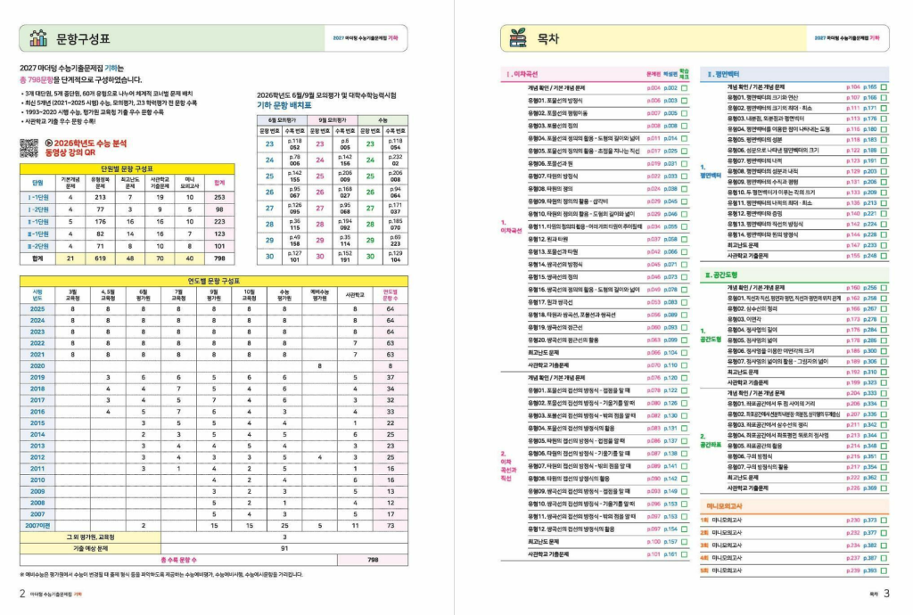 이 교재는 최근 5개년 수능과 모의평가, 고3 학력평가 전 문항뿐만 아니라 이전 기출 중 우수 문항과 사관학교 기출문제까지 포함하여 총 700문항 이상을 수록하고 있습니다. 이차곡선, 평면벡터, 공간도형과 공간좌표 단원을 중심으로 구성되어 있으며, 기본 개념 문제부터 유형 정복, 최고난도 문제까지 단계적으로 학습할 수 있도록 배열되어 있습니다. 또한 단원별로 세분화된 다양한 유형을 제공하여 부족한 부분을 집중적으로 보완할 수 있도록 설계되어 있습니다.
