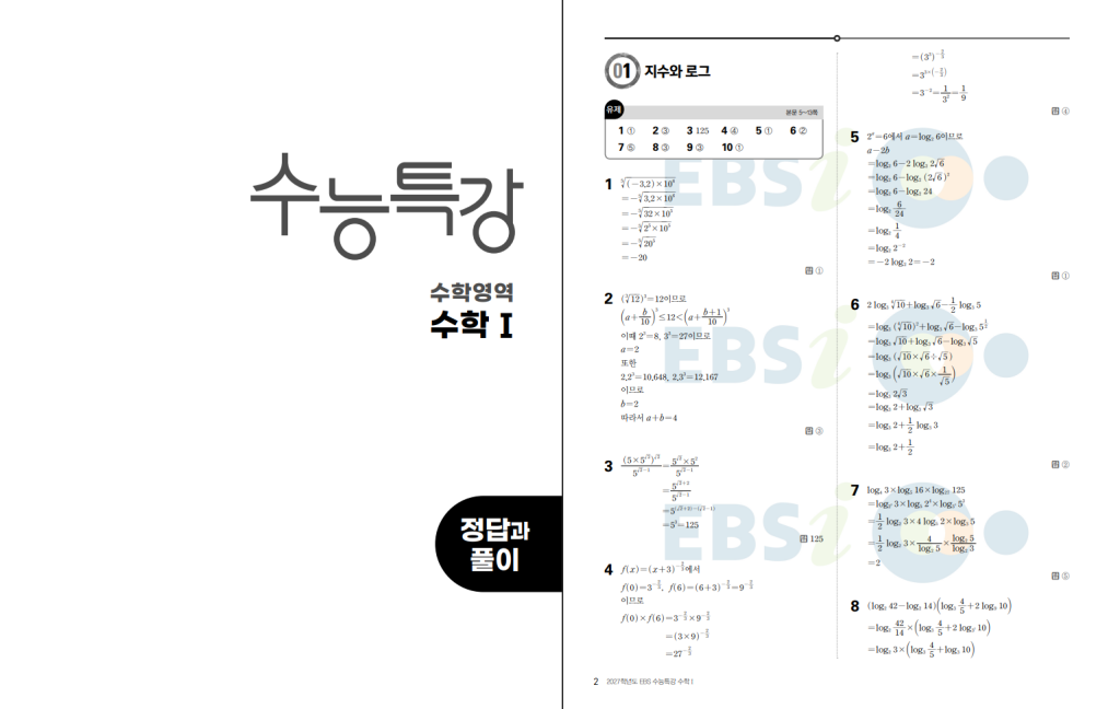EBS 수능특강 수학영역 수학1 (2026년)은 2027학년도 수능을 준비하는 학생이라면 기본으로 잡아야 하는 수능 연계교재입니다. 수1은 지수와 로그, 삼각함수, 수열처럼 한 번 꼬이면 끝까지 흔들리는 단원이 많아서, 처음부터 개념을 정확히 세워 두는 게 중요합니다. 이 교재는 최신 수능 경향과 기출 유형을 반영해서, 단원별 핵심을 빠르게 정리하고 문제 풀이로 바로 연결되게 만든 흐름이 장점입니다. 그래서 겨울방학이나 학기 초에 한 바퀴 돌려두면, 이후 문제집을 풀 때 속도와 정확도가 확 달라집니다. 아래 수능특강 수1 답지 pdf 올려두겠습니다.