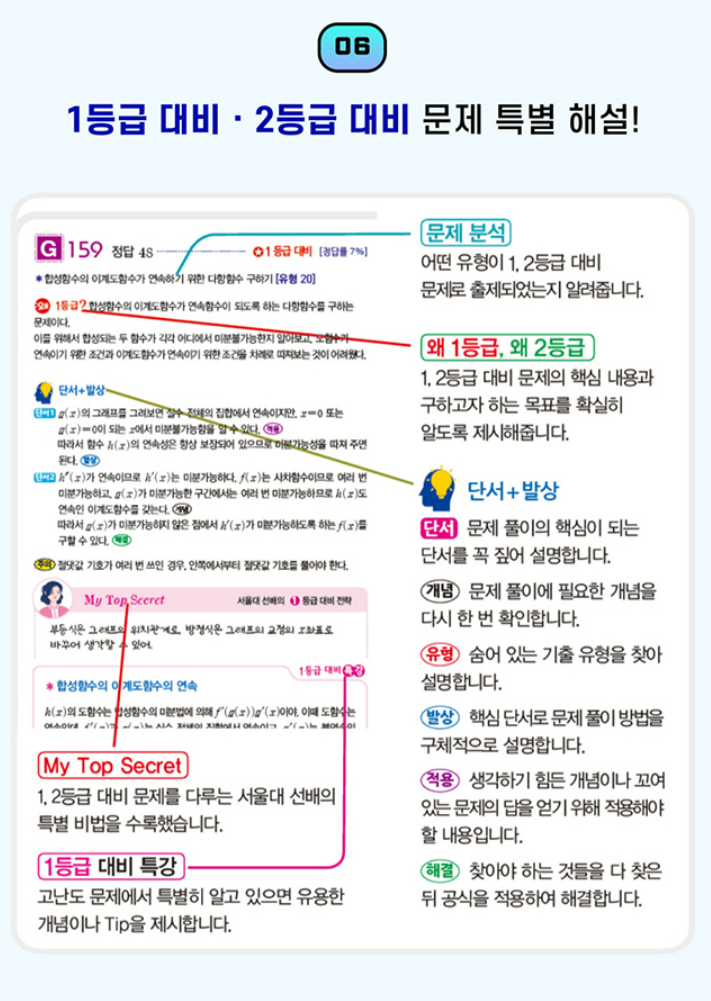 이 책의 강점은 해설이 단순히 정답만 보여주는 게 아니라, 왜 그 풀이가 나오는지 흐름을 잡아 준다는 점입니다. 놓치기 쉬운 주의 포인트, 실수하기 쉬운 구간, 보기 좋은 첨삭 해설이 같이 있어 혼자 공부할 때도 방향을 잃지 않습니다. 또한 다른 풀이, 더 쉬운 풀이처럼 여러 접근을 같이 보여줘서, 한 가지 방법에만 매달리다가 막히는 시간을 줄여 줍니다. 1등급과 2등급을 가르는 문제는 단서와 발상, 적용을 따로 잡아 주는 편이라 상위권 도약에도 도움이 됩니다.