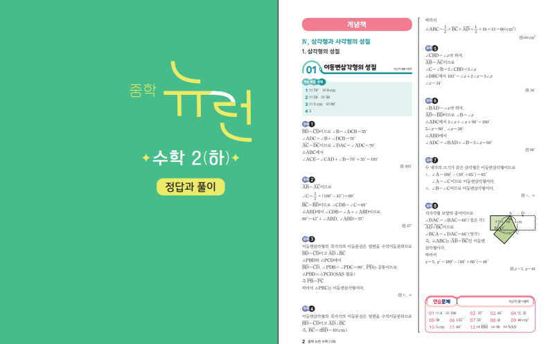 이 교재는 삼각형과 사각형의 성질, 도형의 닮음과 피타고라스 정리, 경우의 수와 확률 등 중2 하 과정의 핵심 내용을 체계적으로 다루고 있습니다. 개념책에서는 각 단원의 핵심 개념을 자세히 설명하고, 실전책에서는 다양한 유형의 문제를 통해 개념을 적용할 수 있도록 구성되어 있습니다. 개념과 문제 풀이가 자연스럽게 연결되어 있어 학습 흐름이 끊기지 않으며, 반복 학습을 통해 개념을 확실하게 정리할 수 있습니다. 아래 링크로 EBS 중학 뉴런 2-2 답지 열람이 가능하도록 안내드립니다.
