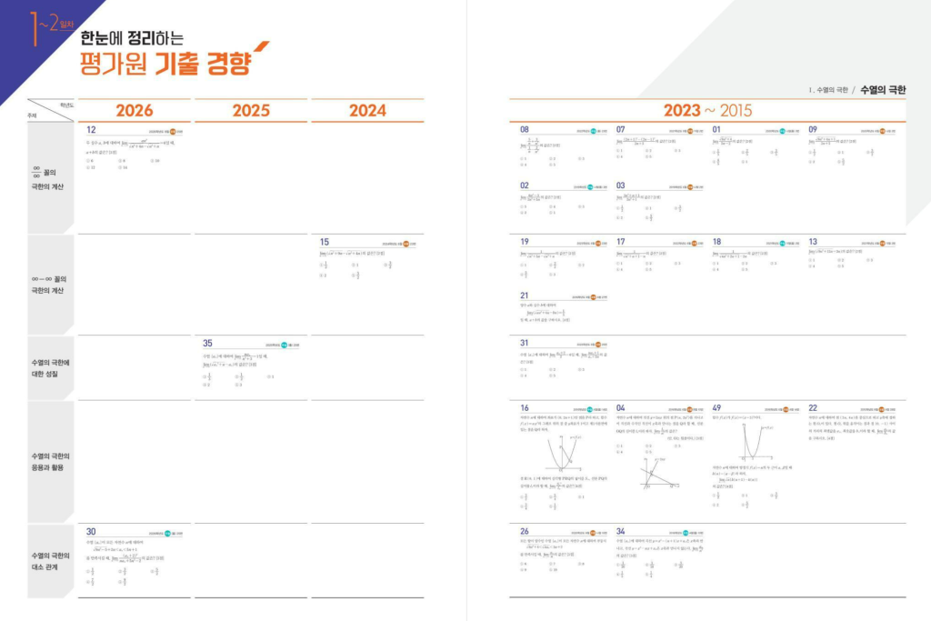 출판사 설명을 보면 기출을 연도별로만 쌓아두지 않고 쉬운 개념부터 복합 개념 순으로, 유형별로 배열했다고 합니다. 이게 실제로 체감이 큰 이유는, 미적분은 앞부분에서 작은 실수가 나면 뒤에서 계산이 길어지면서 더 크게 무너질 수 있기 때문입니다. 그래서 초반에는 쉬운 문제로 손을 풀면서 개념을 빠르게 확인하고, 뒤로 갈수록 복합 유형으로 실전 감각을 올리는 방식이 효율적입니다. 기출 경향을 설명으로 길게 늘어놓기보다 문제 자체로 보여준다는 방향도, 공부할 때 덜 지치게 만들어 줍니다.