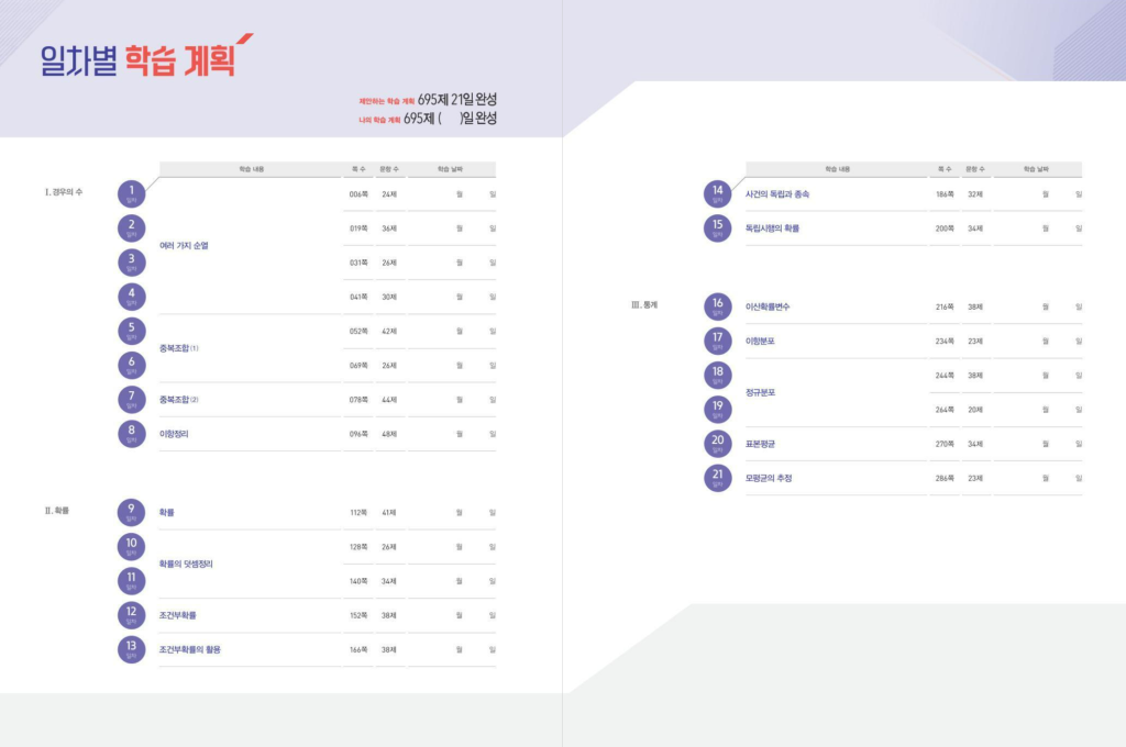 구성은 경우의 수, 확률, 통계 순서로 핵심을 깔끔하게 잡아줍니다. 경우의 수에서는 여러 가지 순열부터 중복조합, 이항정리까지 이어져서 기본기를 단단히 만들고, 확률 파트에서는 덧셈정리와 조건부확률, 독립과 종속, 독립시행처럼 수능에서 자주 출제되는 흐름을 한 번에 정리하게 됩니다. 통계 파트는 이산확률변수에서 이항분포, 정규분포, 표본평균, 모평균의 추정까지 연결되어 있어서, 뒤로 갈수록 계산보다 해석과 판단이 중요해지는 포인트를 훈련하기 좋습니다.
