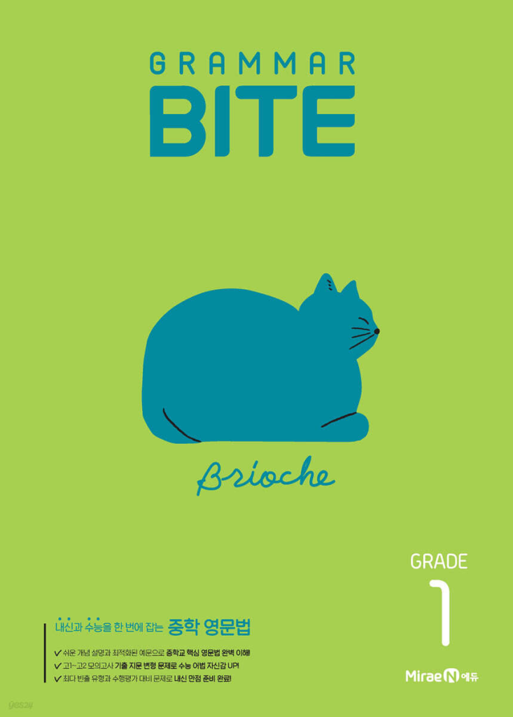 구성을 보면 먼저 Intro에서 꼭 알아 두어야 할 문법 포인트를 정리하며 시작합니다. 이후 Chapter 1~3에서는 be동사와 일반동사, 현재·과거·미래·진행 시제를 정리해 동사의 기본을 탄탄하게 잡아 줍니다. 이어서 조동사, 명사와 관사, 대명사 단원이 연결되면서 문장에서 주어와 동사의 관계, 수 일치, 관사 사용처럼 학교 시험에서 자주 틀리는 부분을 다시 한 번 정리할 수 있습니다. 중간중간에 들어 있는 ‘수능 Grammar BITE’ 코너에서는 고1~고2 모의고사 기출을 중1 수준에 맞게 재구성해, 실제 수능 문법 유형이 어떤 식으로 출제되는지 미리 맛볼 수 있게 했습니다. 아래 링크를 통해 Grammar BITE1 답지를 열람할 수 있습니다.