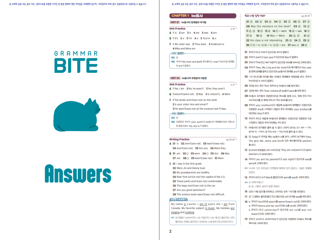 책 뒤에는 Workbook 형태의 복습 문제가 함께 실려 있어, 한 번 푼 단원을 다시 정리하거나 시험 직전에 빠르게 훑어볼 때 활용할 수 있습니다. 정답과 해설은 별도의 정답 파트에 모여 있어 혼자 공부하는 학생도 채점과 오답 정리를 한 번에 할 수 있습니다. 공부할 때는 학교 진도에 맞춰 해당 단원을 먼저 개념과 예문까지 읽고, 기본 문제를 풀어 본 뒤, 시험을 앞두고는 마무리 정리를 해 주면 좋습니다. 중1 영어 내신을 준비하면서도, 나중에 고등 문법과 수능까지 이어질 기초를 미리 다져 두고 싶은 학생과 학부모에게 추천할 만한 교재입니다. 본문에 그래머바이트 1 답지 pdf 파일을 첨부해두었습니다. 최근에 개정되었으므로 표지를 꼭 확인하시길 바랍니다.