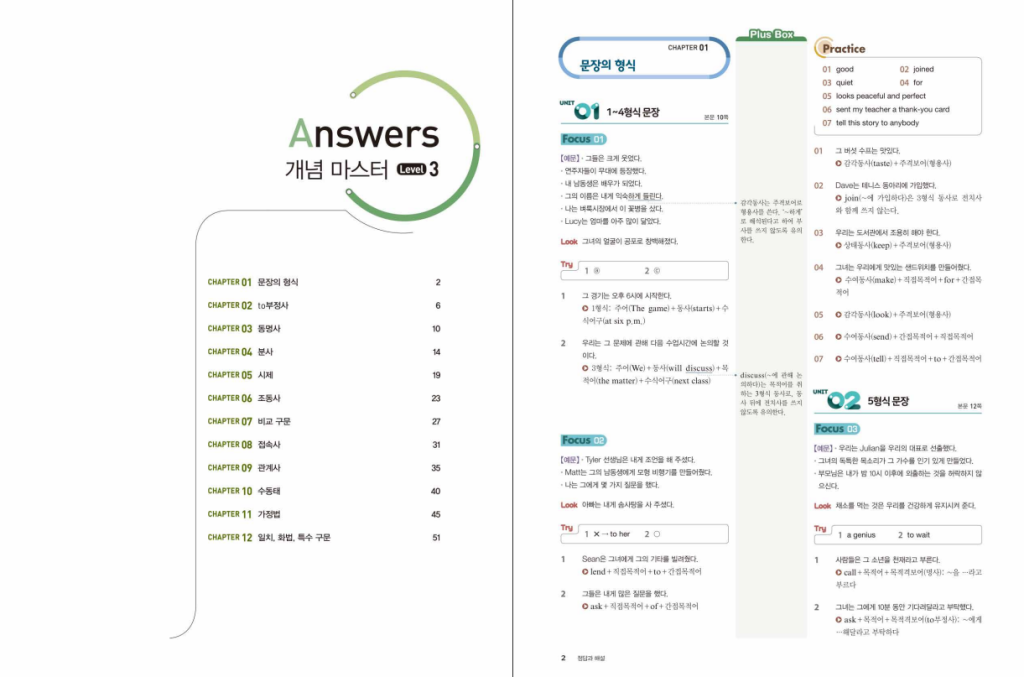 이 책의 가장 큰 특징은 이름 그대로 “개념+문제”를 한 흐름으로 묶어 둔 점입니다. 앞부분 개념 마스터에서는 각 챕터마다 주요 개념을 먼저 간단히 보여 준 다음, 도식과 예문을 활용해 상세 설명과 보충 설명을 덧붙여 줍니다. 예를 들어 분사, 가정법, 관계사처럼 중3에서 처음 본격적으로 깊게 다루는 단원도 문장의 구조를 그림처럼 보여 주기 때문에, 문장 안에서 어떤 역할을 하는지 그림을 떠올리면서 이해할 수 있습니다. 단순 암기가 아니라 “왜 이런 형태가 쓰이는지”를 반복해서 보여 주는 방식이라, 고등 문법으로 이어질 때도 머릿속에 틀이 남는다는 점이 장점입니다. 아래 링크를 통해 중학영문법 그래잇 개념+문제 3 답지를 열람할 수 있습니다.