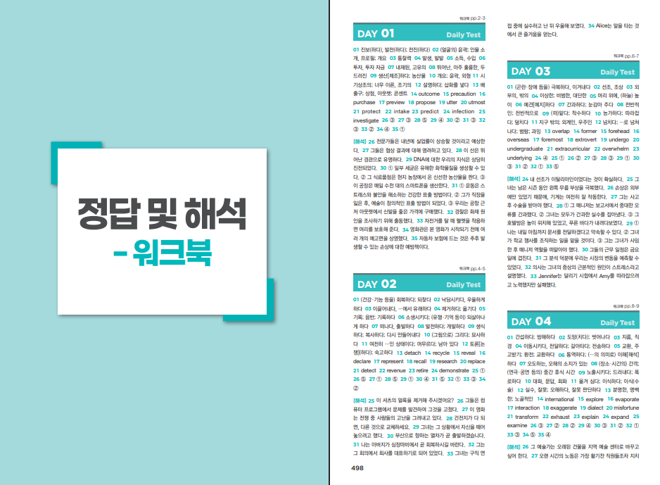 위 링크를 통해 능률 보카 고등 어원편 답지를 열람할 수 있습니다. 단어장이라서 따로 ‘답지’라고 부르지는 않지만, 이 책은 Day별 테스트와 Review Test가 워크북으로 제공되고, 뒤쪽에 정답 및 해석 파트가 같이 실려 있기 때문에 학생이 혼자 학습해도 채점이 가능합니다. 특히 어원 기반 단어장은 한 번에 다 외우기보다 자주 보고 듣는 게 중요한데, 이 책은 MP3와 QR을 무료로 주기 때문에 학부모가 “이건 꼭 매일 20분씩 들어라”라고 관리하기가 수월합니다 학습자료는 모두 홈페이지에서 확인할 수 있습니다.