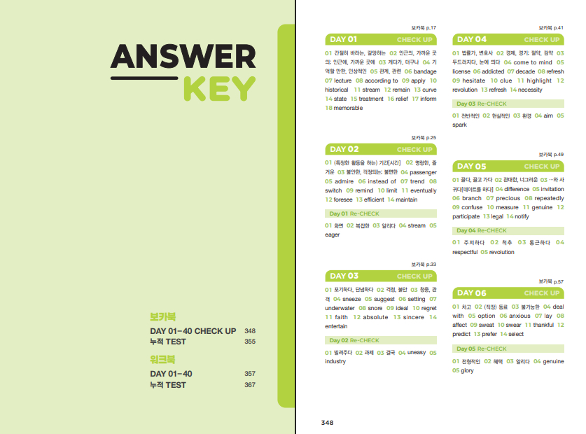 하루 학습은 DAY 1~40으로 나뉘며 5일마다 누적 TEST를 배치해 회독 리듬을 유지하게 했습니다. 각 표제어에는 유의어·반의어·파생어 등 연관 어휘를 곁들여 의미 맥락을 확장하고, CHECK UP 문항으로 즉석 점검을 돕습니다. QR/MP3 지원으로 발음과 억양까지 확인할 수 있어 듣기·말하기 감각을 함께 끌어올릴 수 있습니다. 이때문에 개인적으로 가장 좋아하는 단어장 시리즈입니다.