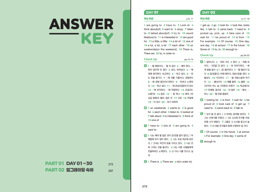 위 링크를 통해 능률 보카 숙어 답지를 열람할 수 있습니다. 복습 동선은 간결하면서도 촘촘합니다. DAY 말미의 CHECK UP, 5일 단위 누적 점검, ‘업그레이딩 숙어’ 파트로 이어지는 다층 복습이 망각 곡선을 완만하게 만들며, 이동 중에는 휴대용 미니북으로 가볍게 회독을 이어 갈 수 있습니다. 권말의 ‘중학 필수 미니 영숙어 사전’은 시험 직전 훑어보기에 최적화되어 있어 막판 점검 효율을 높여 줍니다.