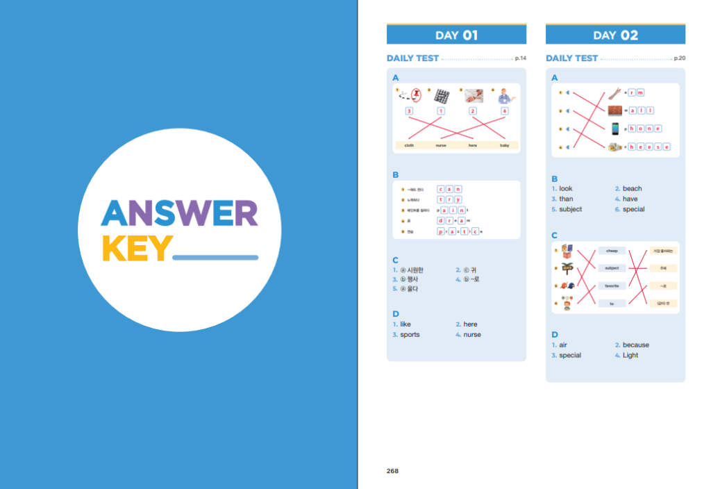 권장 학습 루틴은 하루 15~20분입니다. ① 표제어·예문 소리 내어 읽기(음원 병행) → ② 예문 따라 쓰기와 철자 체크 → ③ Day 말미 미니퀴즈로 확인 → ④ 오답만 미니북·음원으로 추가 노출 순서로 진행하십시오. 주 5일 루틴이면 약 8주에 1회전을 마칠 수 있으며, 2회전은 리뷰·누적 TEST 중심으로 속도감 있게 돌리면 효과가 극대화됩니다. 초등 필수 어휘를 단단히 다지면서 중학교 입학 준비까지 한 번에 끝내고 싶은 학습자에게 특히 적합합니다. 본문에 능률 VOCA 초등필수 답지 pdf 파일 첨부해두었습니다.
