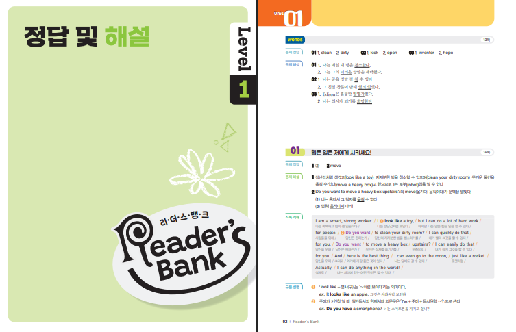 위 링크를 통해 Reader’s Bank Level 1 답지를 열람할 수 있습니다. 학습 방식 쪽에서도 세심하게 신경 쓴 부분이 많습니다. 각 지문에는 단어 정리와 직독직해식 해석, 문법과 구문 설명이 함께 담긴 정답 및 해설이 있어서, 아이 혼자 풀어도 “왜 이게 정답인지”, “이 문장은 이렇게 끊어 읽으면 되는구나”를 스스로 확인할 수 있습니다. 또 QR코드로 바로 들을 수 있는 단어·지문 음원, 지문별 단어와 직독직해 연습을 위한 워크북, 주요 단어만 모아 둔 단어집, MP3 파일까지 제공되어서, 듣기와 말하기 연습까지 함께 묶어 영어 감각을 키우는 데 도움이 됩니다. 집에서 공부할 때는 본책으로 문제를 풀고, 정답 및 해설에서 해석과 설명을 확인한 뒤, QR코드로 음원을 들으며 다시 한 번 소리 내 읽기 연습을 시켜 보면 좋겠습니다.